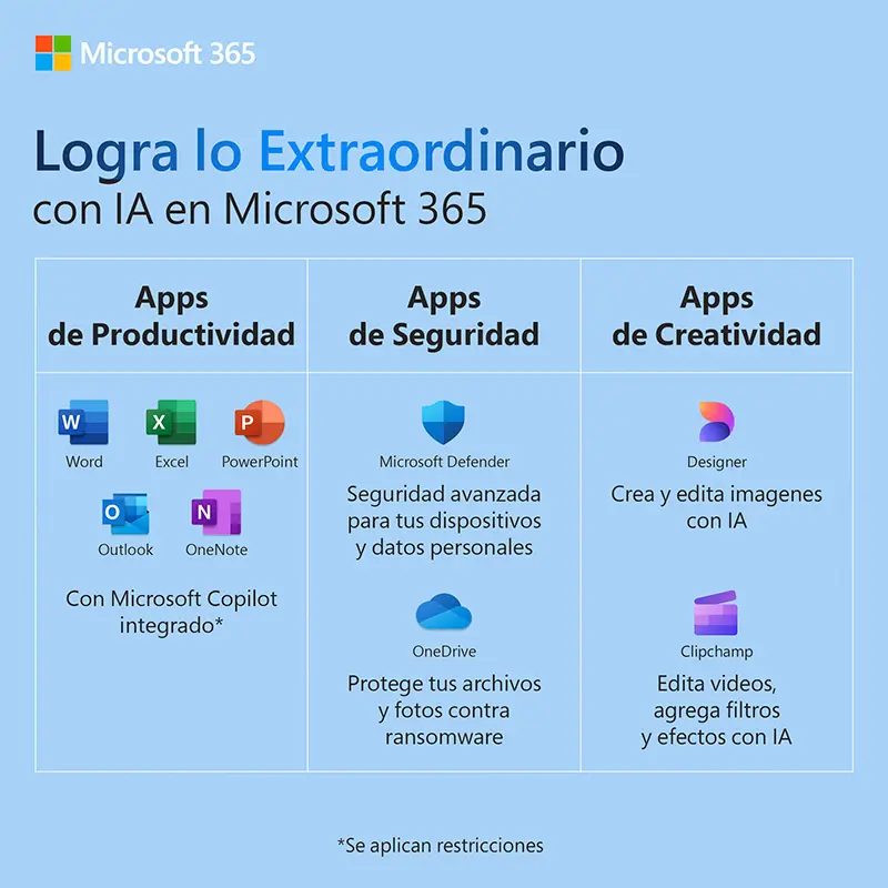 CARACTERISTICAS | ES UNA LICENCIA DE SUSCRIPCIÓN PARA UNA A SEIS PERSONAS QUE INCLUYE HASTA 6 TB DE ALMACENAMIENTO EN LA NUBE (1 TB POR PERSONA), POTENTES APLICACIONES DE PRODUCTIVIDAD, HERRAMIENTAS DE CREATIVIDAD Y SEGURIDAD DIGITAL, AHORA IMPULSADAS CON INTELIGENCIA ARTIFICIAL, TODO EN UN SOLO PLAN. | CADA PERSONA PUEDE USAR HASTA CINCO DISPOSITIVOS SIMULTÁNEAMENTE. | FUNCIONA EN PC, MAC, IPHONE, IPAD Y TELÉFONOS Y TABLETAS ANDROID. | HASTA 6 TB DE ALMACENAMIENTO SEGURO EN LA NUBE (1 TB POR PERSONA). | APLICACIONES DE ESCRITORIO DE WORD, EXCEL, POWERPOINT, Y ONENOTE CON MICROSOFT COPILOT INTEGRADO QUE TE AYUDARA A CREAR CONTENIDO, HACER SEGUIMIENTO DE TU PRESUPUESTO Y TERMINAR TUS PROYECTOS MÁS FÁCILMENTE. | INCLUYE DESIGNER, APLICACIÓN DE DISEÑO Y EDICION DE IMAGENES, POTENCIADA CON IA. | INCLUYE CLIPCHAMP, EDITOR DE VÏDEO CON FILTROS Y EFECTOS PREMIUM. | SEGURIDAD AVANZADA DE MICROSOFT DEFENDER PARA SUS DATOS PERSONALES Y DISPOSITIVOS. | PROTECCION CONTRA RANSOMWARE DE ONEDRIVE PARA TUS FOTOS Y ARCHIVOS. | LAS FUNCIONES DE IA SOLO ESTAN DISPONIBLES PARA EL PROPIETARIO DE LA SUSCRIPCION. SE APLICAN LIMITES DE USO. | APLICACIONES PRINCIPALES: | WORD, EXCEL, POWERPOINT, OUTLOOK, ONENOTE, ACCESS, PUBLISHER | HERRAMIENTAS ADICIONALES: | ONEDRIVE, MICROSOFT TEAMS, DESIGNER, CLIPCHAMP, MICROSOFT EDITOR, WHITEBOARD, FORMS, LOOP | |